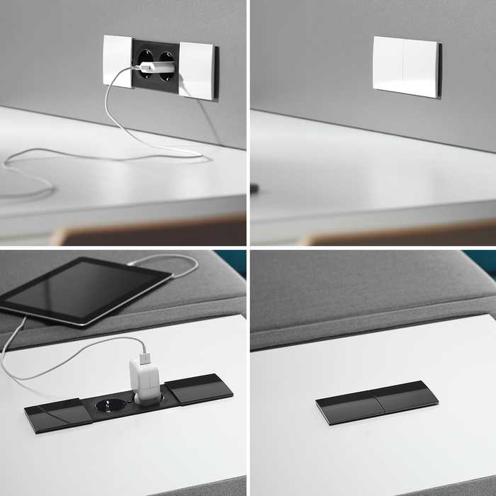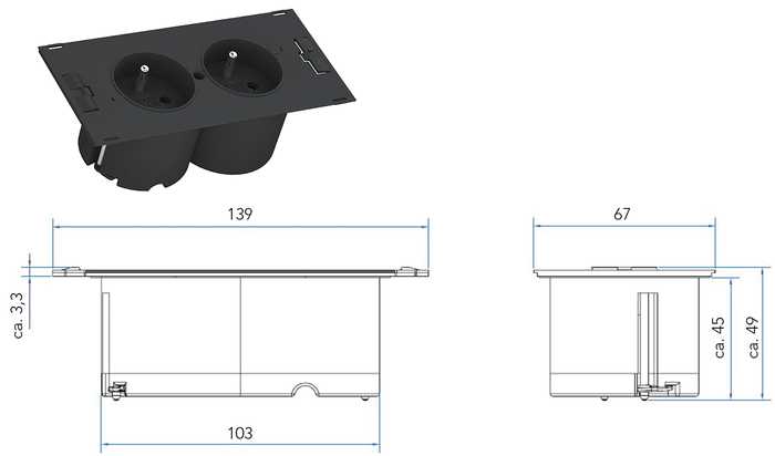 | 022353 | Zwart kunststof | 2 stopcontacten met pinaarding (FR/B) | 2 x 56 mm | 1 stuk |