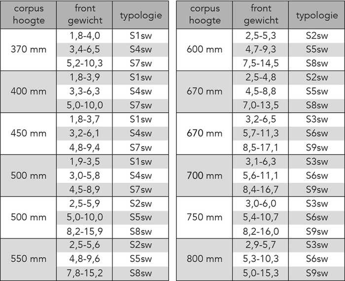- frontgewicht: van 1,8 kg tot 17,1 kg