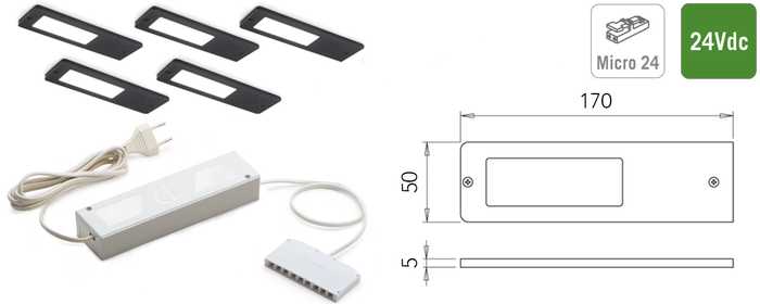 | 048410 | Aluminium | Set 5 spots | Super warm wit, 2700°K | 450 lux/300 lm | 24Vdc | 5 x 5W | 1 set |