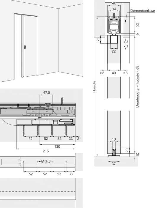 - schuifdeurbeslag voor 1 deur van max. 100 kg