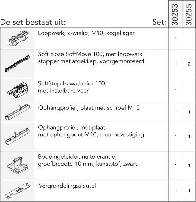 | Bestelnr. | Afwerking | Omschrijving | Voor deurdikte | Max. gewicht per deur | Ref. Hawa | Besteleenh. |